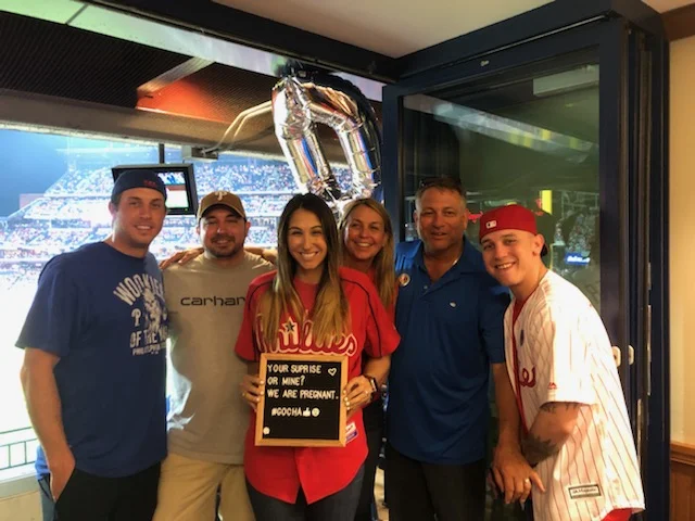 Mike and I have waited a long time to tell our parents this news. Neither of them knew the actual day of or our transfer. We tricked my mom, so when the time came, we could surprise her. She thought my transfer was the upcoming Saturday. Luckily, she knew nothing about the bed rest rules, or things I actually had to do on the day of my transfer. She thought I was good to go, which is why she was not concerned in the least that she had planned a 30th birthday surprise party for me at the Phillies game on the very same day. Out of all the dates to pick from, I picked the same ‘fake transfer date’ she did for my birthday surprise. Go figure. My poor husband was living a double lie, keeping a big secret from me, and an even bigger secret from my mom. Michael told me he had a corporate suite thanks to work, and we had to go to the game because “everyone” was going to be there with their wives. I was scheduled to work. , so I found a way to do both. I’d go in for a couple of hours, and then go home, pickup Mike and head to the game. Things changed rather quickly when I started to get violently ill at work. Every 10-15 minutes, I was sprinting to the bathroom to get sick. I told the girls I had to home, and cried the entire drive back. Michael was dressed and ready for the game when I walked in. I told him there was no way I was going. I had already called the Doctor, who assured me it was a not morning sickness. Apparently when you’re pregnant your immune system goes way down, I have a crap immune system to begin with, so lucky me had a stomach bug. The Doctor instructed me to get lots of rest and take it easy. I had zero intentions of going to a Phillies game. That changed again when my sister in law called me. She told me she knew I wasn’t feeling well, but I had to suck it up and make my way to the game, because it was my surprise party. I was furious at my mother in that moment. I did not want a surprise party, especially not now. Besides, I have been avoiding her like the plague since I got the news! We wanted to tell our parents on Mother’s Day, and we were still one week out! Now, I had to go face to face with my mother, who would surely know something was up every time I’d take off to the bathroom to be sick. I went downstairs and told Michael if we’re going, we’re sharing the news. I had to turn this negative situation into a positive. It wasn’t anyone’s fault I was sick. I wanted to make the best of it, and I wanted to turn this surprise around on my family. Mike wasn’t a big fan of the idea. He really liked our Mother’s Day plan, but I told him there was no way I was going to get away with not sharing on this very night, and although he didn’t want to, he agreed. I put on my jersey, laced up my converses, grabbed my letter board, and we were on our way. In between pulling over to be sick, I wrote out on the letter board, ‘Your surprise or mine? We are pregnant!’